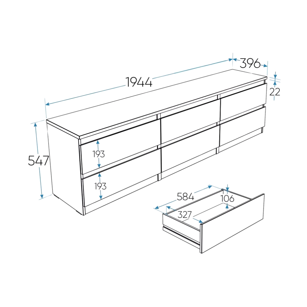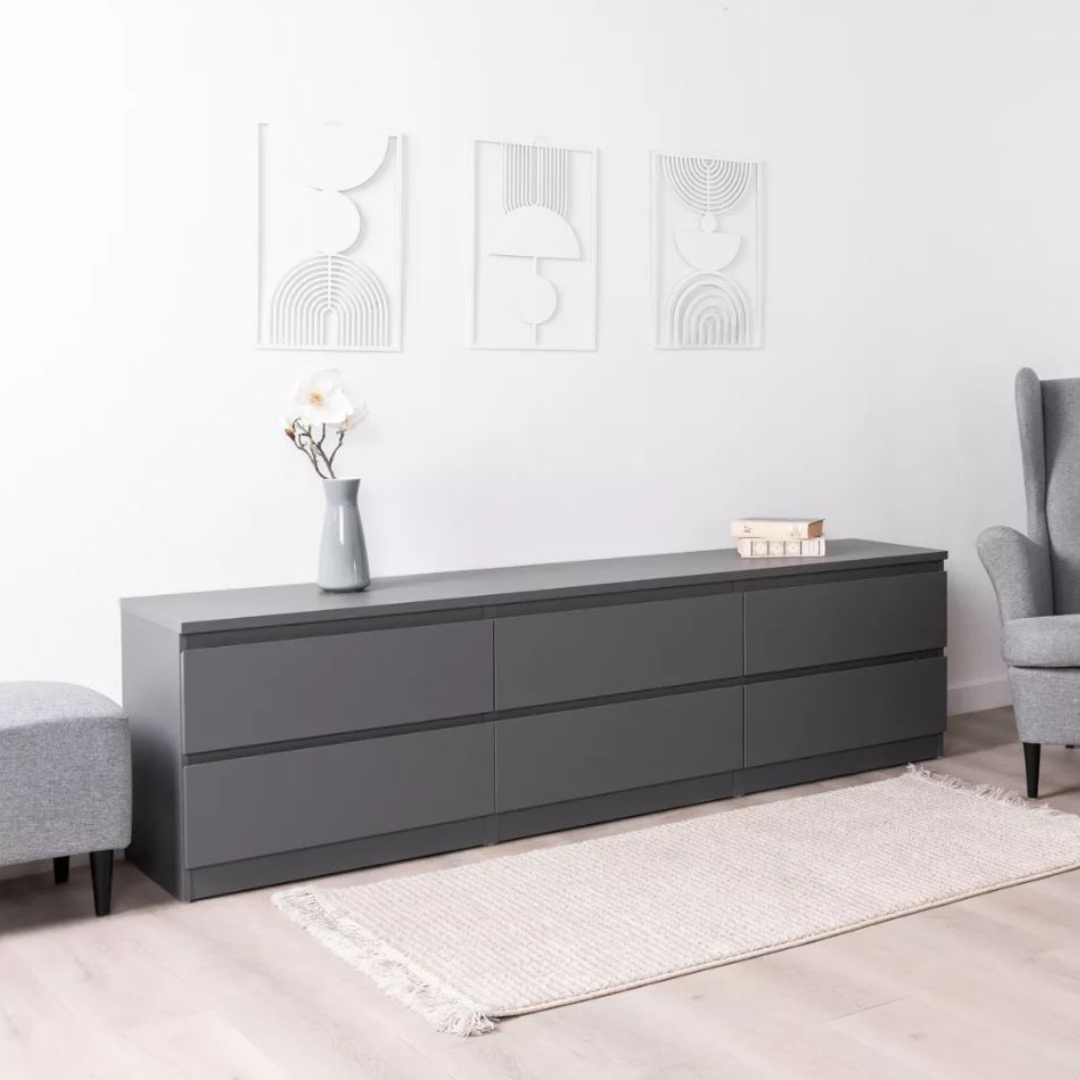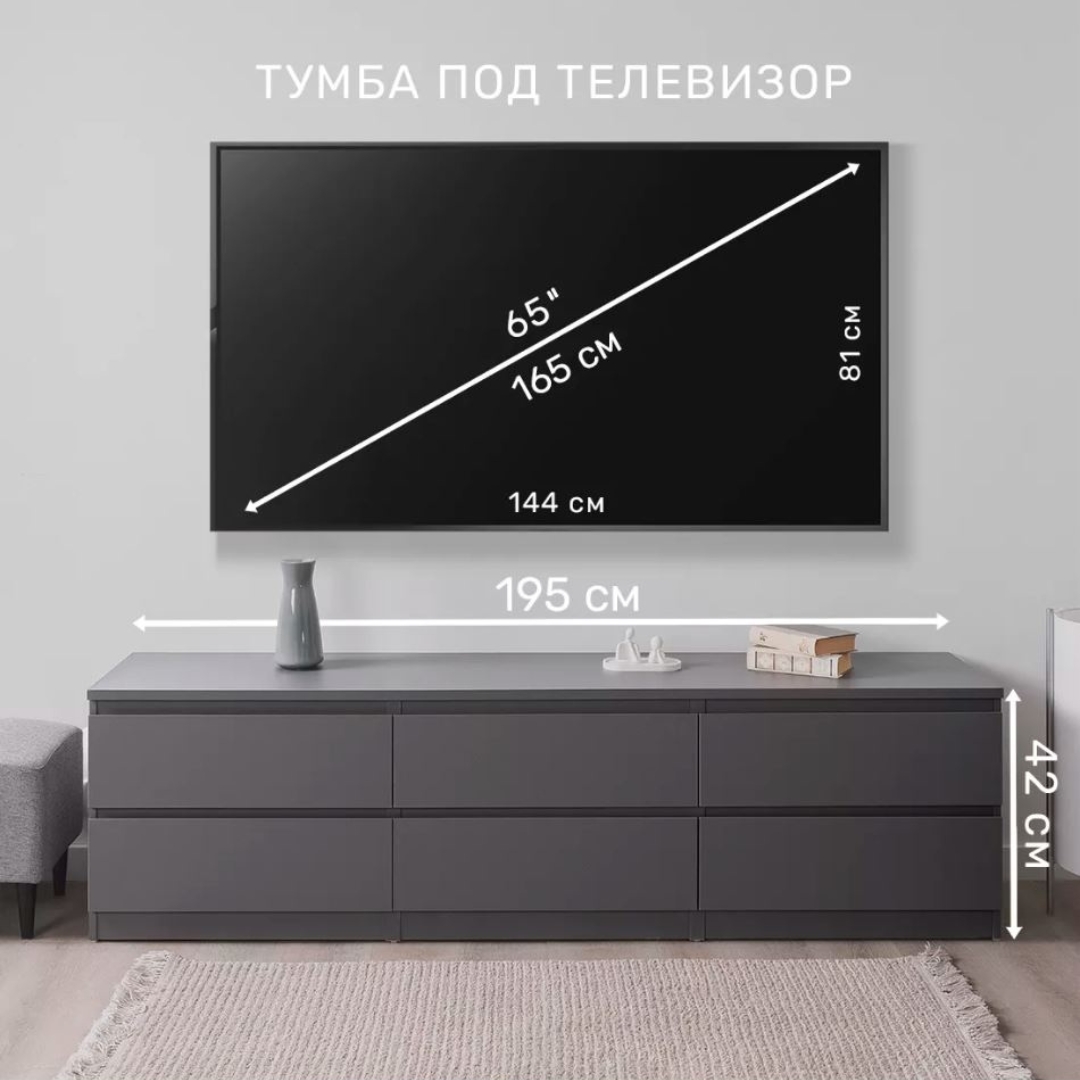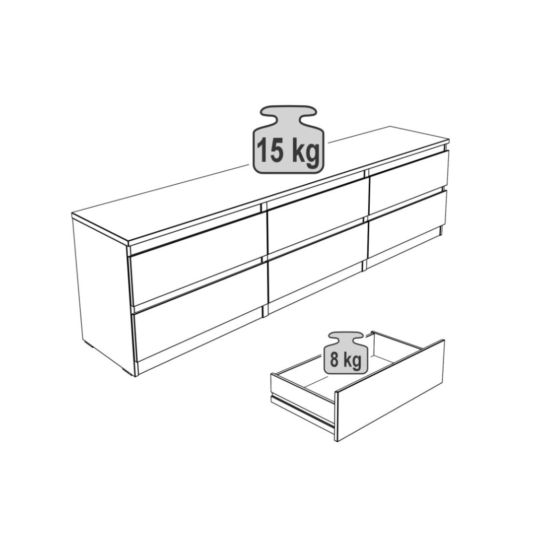 Комод с 6 ящиками без лицевой фурнитуры и шириной почти 2 метра будет прекрасной тумбой под ТВ, ведь максимальная рекомендованная нагрузка на столешницу 15 кг.