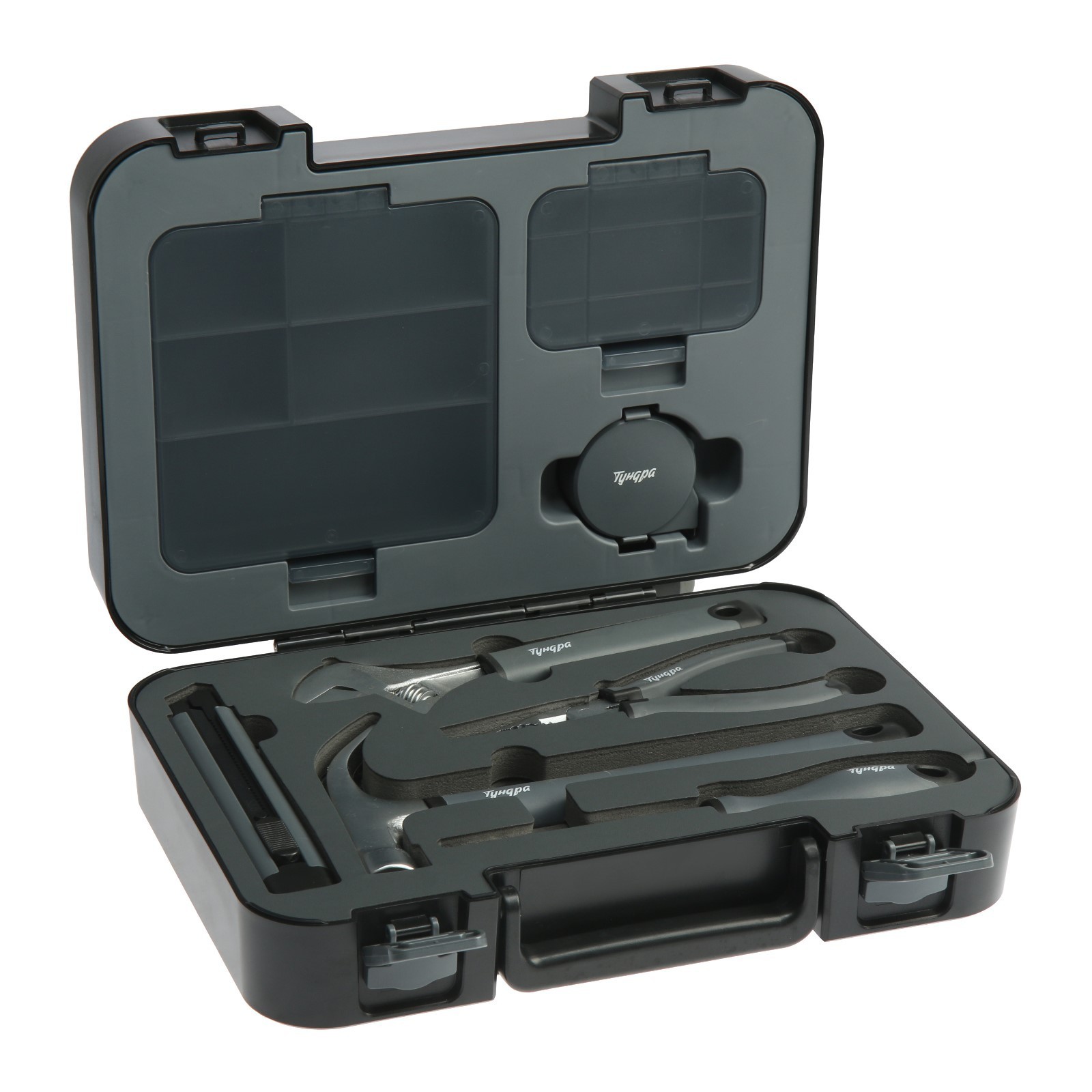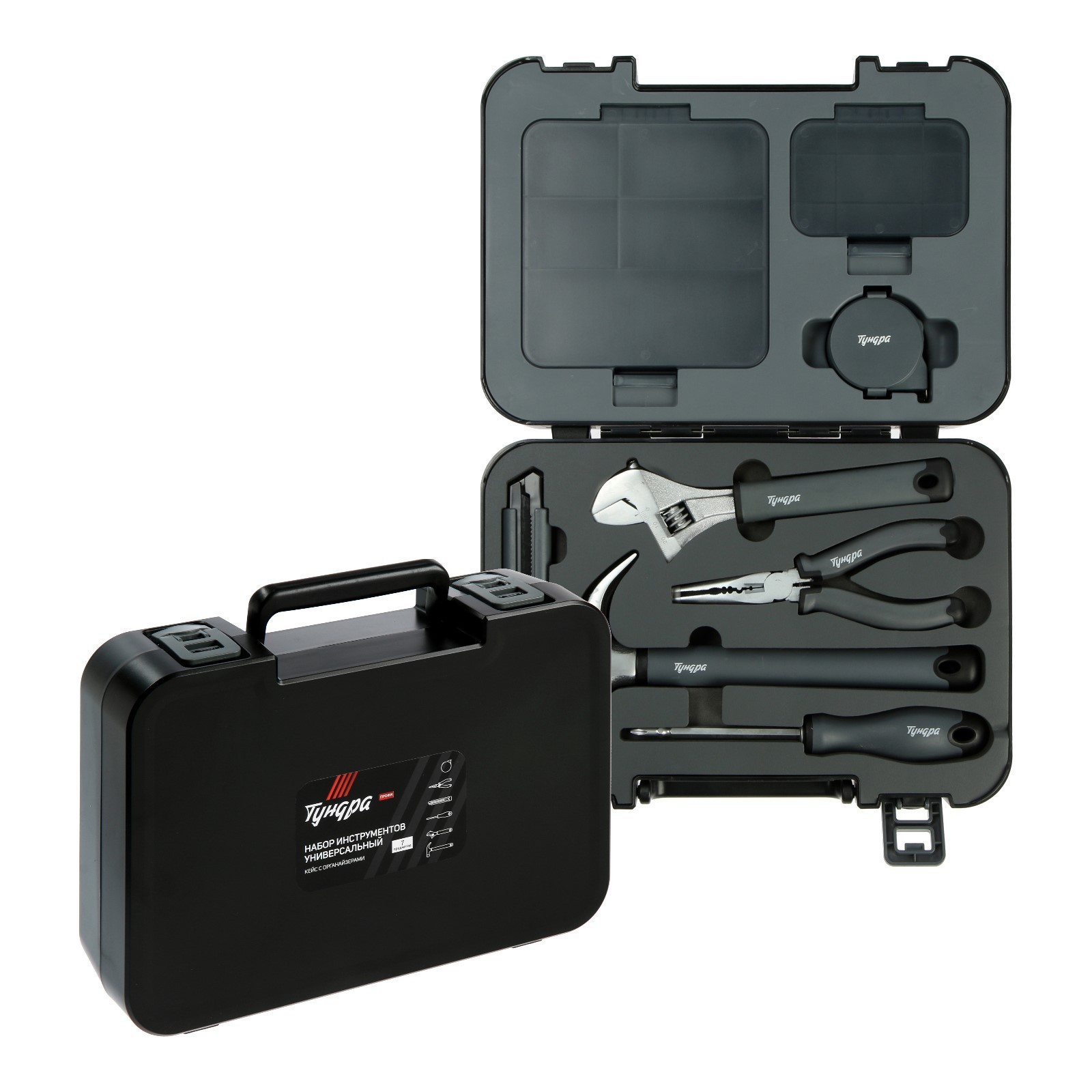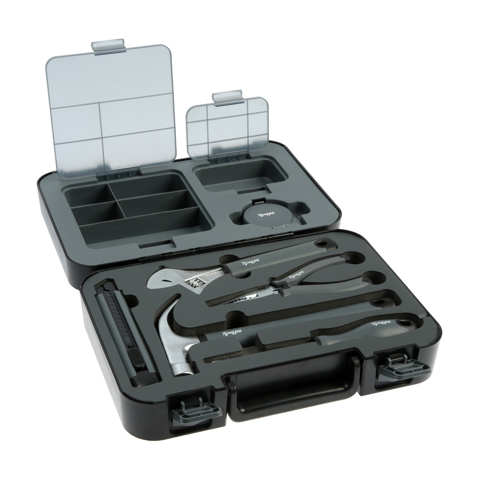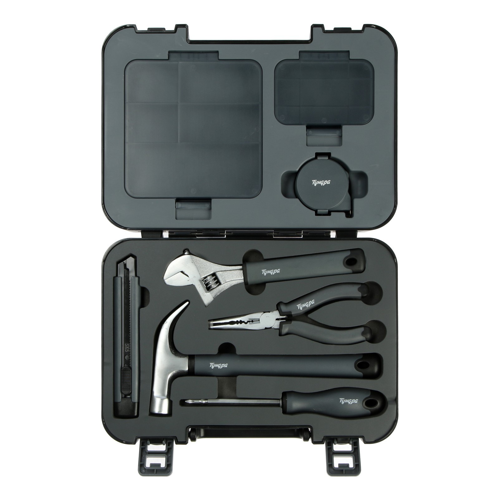 Составляющие набора: Длинногубцы, Молоток, Нож, Разводной ключ, Рулетка