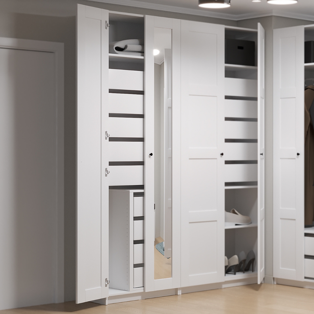 Выберите нужные каркасы, двери и наполнение — в результате вы получите гардероб, идеально подходящий для вашего дома и ваших вещей.