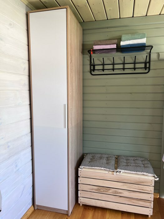 Внутри шкафа расположены пять вместительных полок для хранения одежды и постельных принадлежностей.