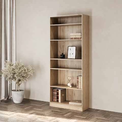 Стеллаж Буккер поможет организовать хранение книг, учебных принадлежностей, предметов быта. Подойдет для спальни или рабочего кабинета. Изготовлен из прочной плиты ЛДСП толщиной 16 мм, сверху отделан гладкой финиш-пленкой цвета «дуб Гикори Джексон».