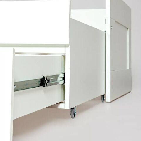Выдвижные ящики оснащены шариковыми(телескопические) направлящими, которые в отличие от роликовых, выдерживают большую нагрузку, имеют плавный ход и служат дольше.