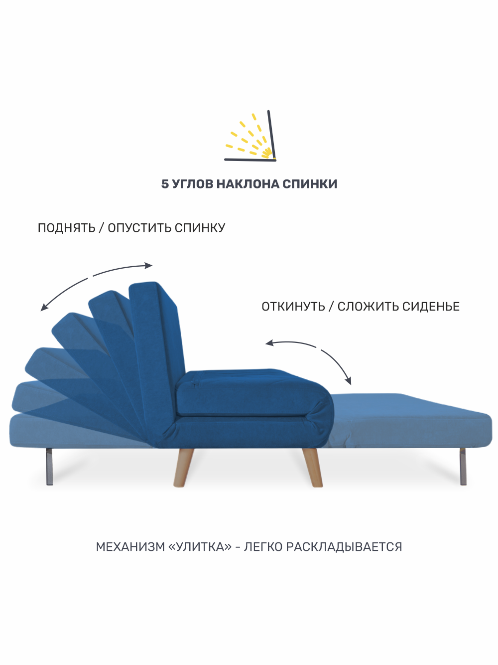 Механизм трансформации улитка - очень прост в использовании, спинка имеет 5 положений: вертикальное «сидя», три дополнительных положения «релакс» и положение «лёжа».