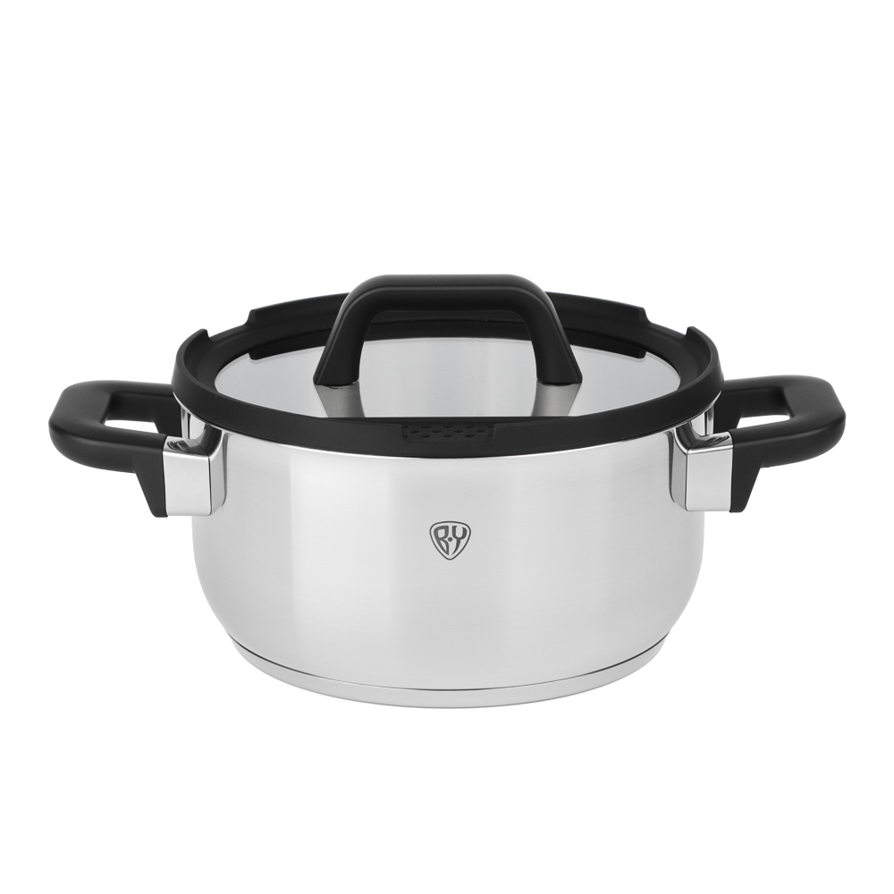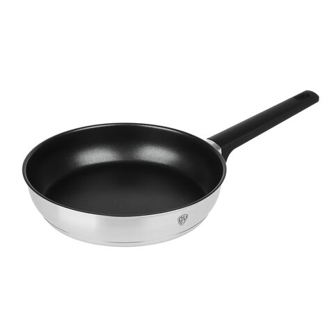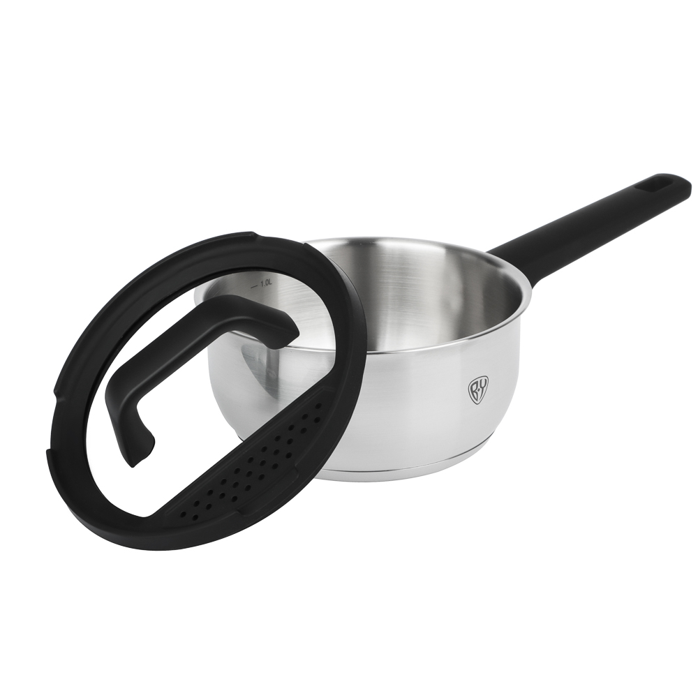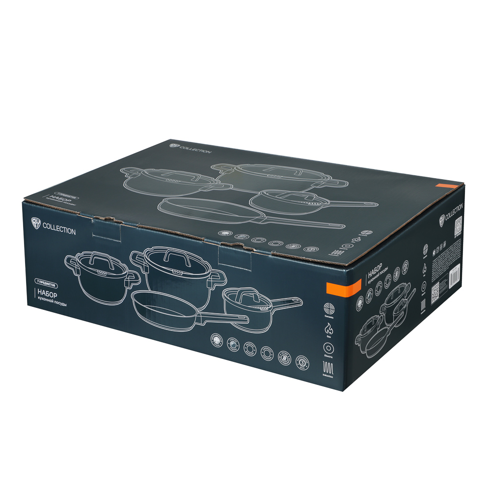 Набор кухонной посуды BY COLLECTION «Inta» из 7 предметов включает все необходимое для приготовления первых и вторых блюд, а также каш и соусов на домашней кухне. Состав комплекта: кастрюли 5 л; 3 л; ковш 1,5 л; сковорода 24 см и 3 крышки. Все предметы изготовлены из высококачественной нержавеющей стали марки AISI-304, обладающей высокой коррозионной стойкостью и прочностью. Кастрюли и сковорода имеют толстое капсульное дно для быстрого нагрева и равномерного приготовления пищи. Бакелитовые ручки не нагреваются, а крышки оснащены сливными отверстиями для удаления жидкостей при варке гарниров и овощей. Шкала объема на внутренних стенках позволяет точно дозировать количество ингредиентов. Сковорода с безопасным антипригарным покрытием позволяет готовить полезные блюда с минимальным количеством масла, а продукты не пригорают и не прилипают. Современный дизайн с хромированной отделкой и эргономичными ручками выигрышно смотрится в любом интерьерном стиле. Набор посуды подходит для всех типо