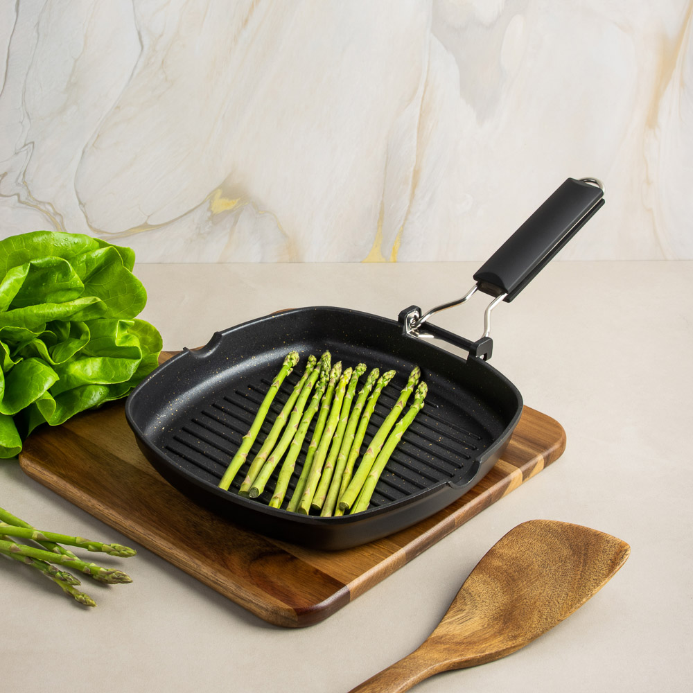 Любите готовить мясо с дымком на свежем воздухе? Прекрасная альтернатива мангалу — сковорода-гриль «Кобальт». Вместо обычного гладкого дна здесь используется ребристая поверхность, позволяющая готовить диетические блюда с одной каплей масла. Теперь вы сможете подавать на обед нежное мясо на ребрышках, курицу с хрустящей корочкой, жареную рыбу и овощи-гриль. И все это с красивым ребристым рисунком.
