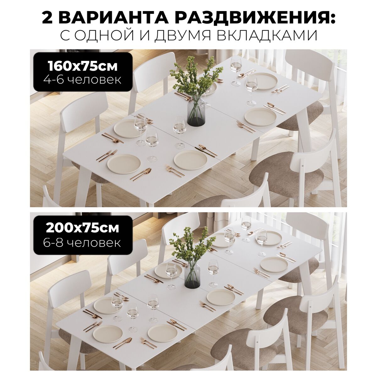 Стол позволяет разместить за собой с комфортом 4-6 человек в сложенном состоянии и до 8 человек — в разложенном.