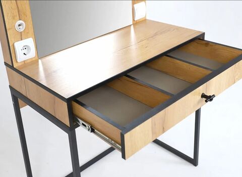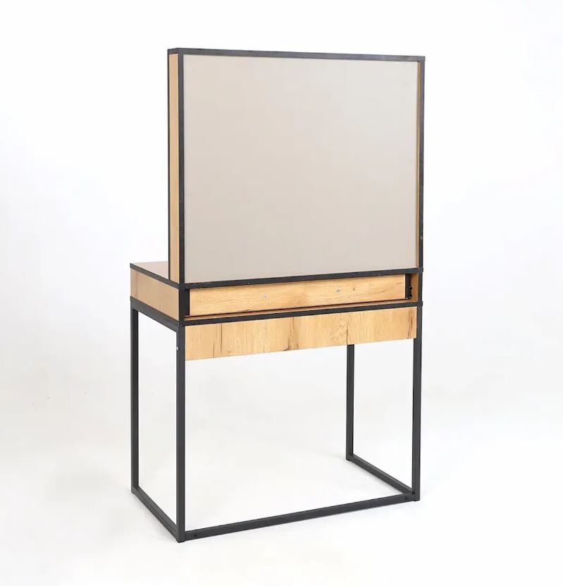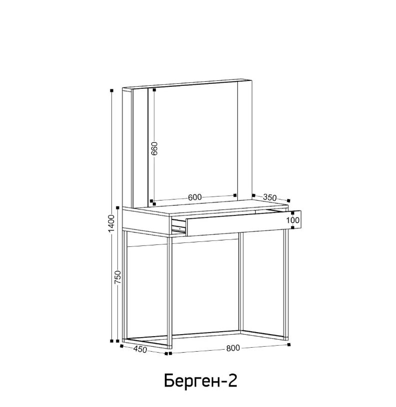 Трюмо «БЕРГЕН» имеет опоры из металлической профильной трубы, вместительный ящик с тремя отсеками для мелочей и большое зеркало с фацетом.