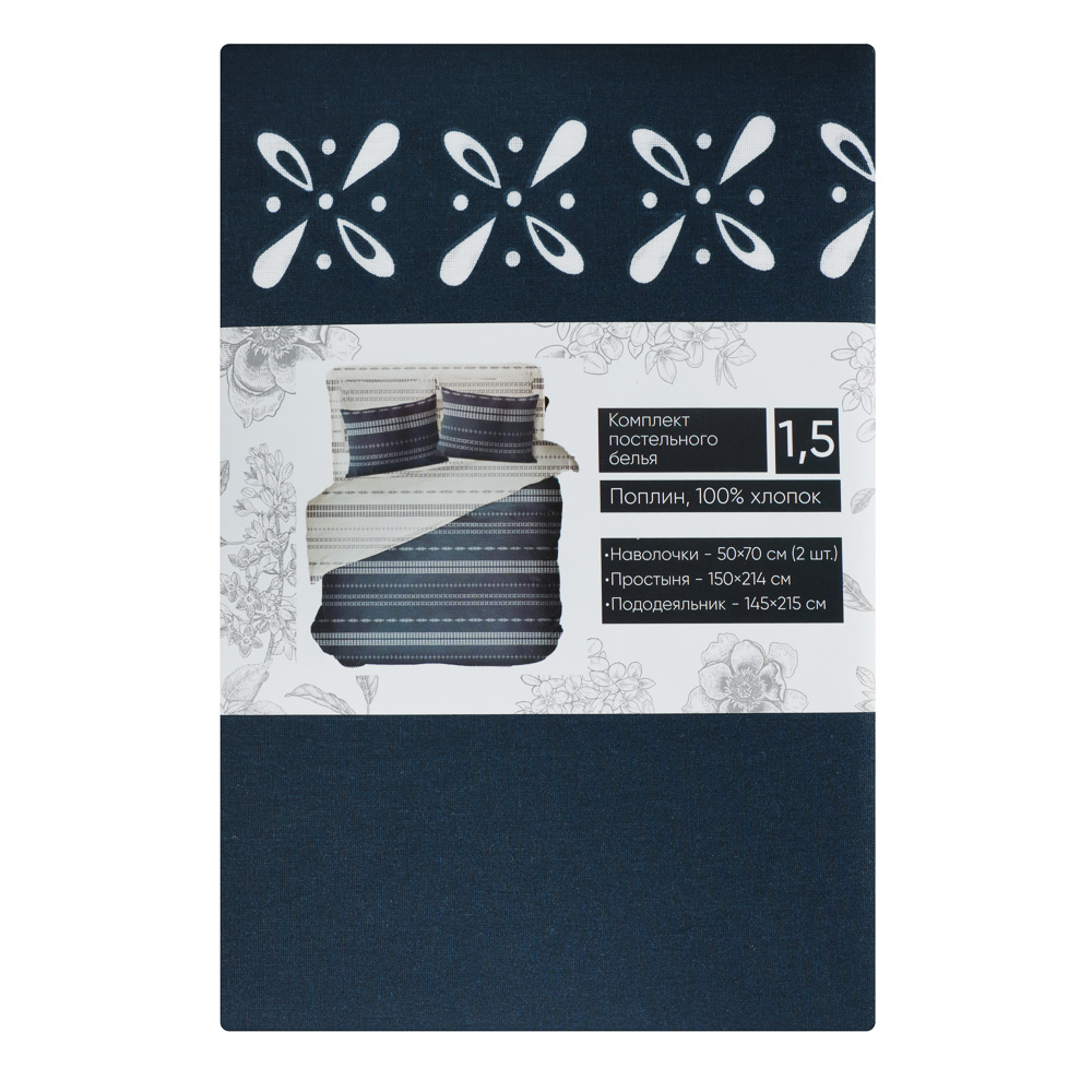В комплект входят четыре предмета: две наволочки размером 50х70 см, простыня размером 150х214 см и пододеяльник размером 145х215 см.