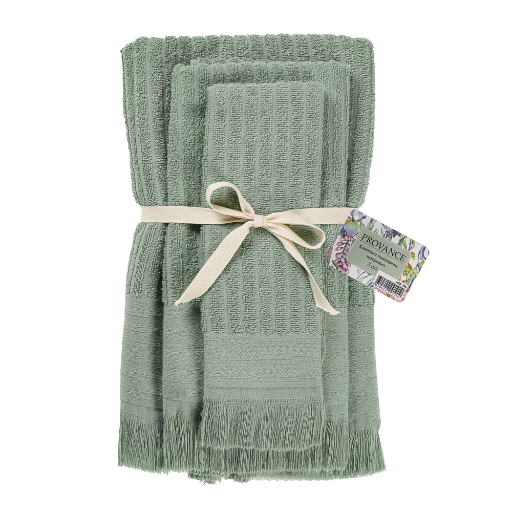 Комплект махровых полотенец PROVANCE Ботаника, 3 изделия (размеры 30х50 см, 50х90 см, 70х130 см), из 100% хлопка – это набор для ухода за собой в нежных пастельных тонах. Каждое полотенце выполнено в едином стиле с тонкой рельефной полосой по центру, что придаёт ему элегантный и утончённый вид. Мягкий, густой и пушистый ворс плотностью 400 г/м2 бережно впитывает влагу, даря коже ощущение комфорта и уюта после душа или умывания. Текстиль отличается высокой износостойкостью, не теряет форму после многократных стирок, не оставляет ворсинок на теле и легко отстирывается, сохраняя яркость цвета и мягкость на протяжении долгого времени. Практичный, красивый и заботливый выбор для ежедневного использования. Цвет в ассортименте.