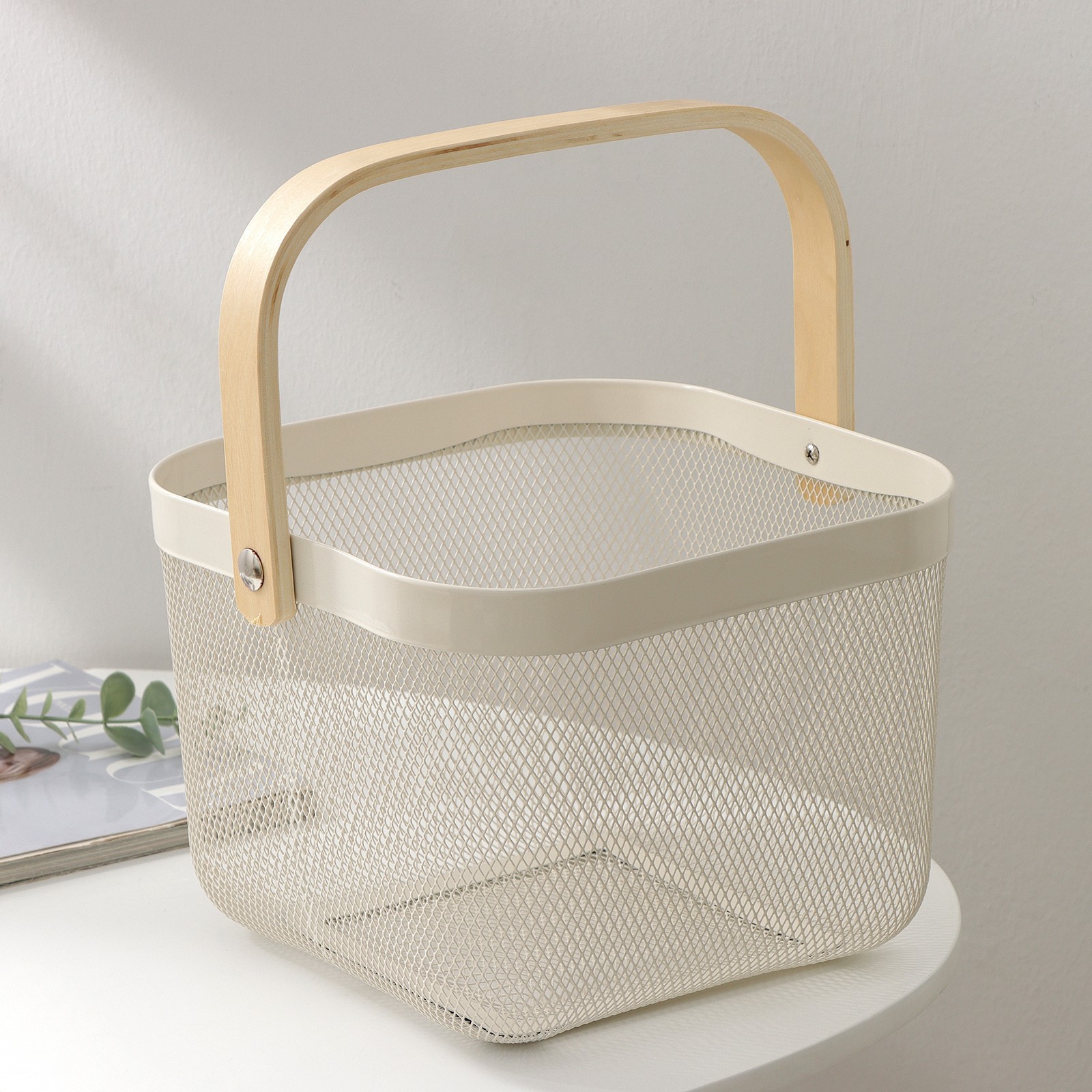Корзинка выполнена из окрашенной стали, что гарантирует её долговечность. А удобная деревянная ручка поможет без труда перемещать корзинку или даже брать её с собой за продуктами или на пикник.