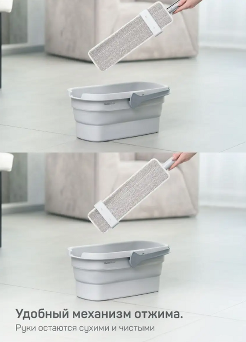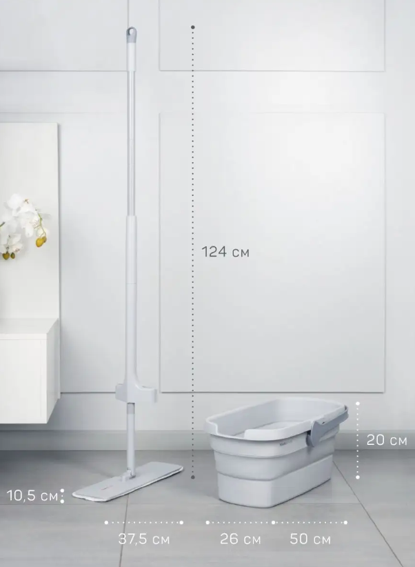 Набор для уборки с шваброй с отжимом и складным ведром – идеальный уборочный инвентарь. Компактная швабра с удобным с запатентованным механизмом отжима разгрузит Вашу спину и убережет руки. Больше не нужно наклоняться и трогать руками грязную мокрую насадку для пола, ваши руки во время уборки остаются сухими. Отжим на ручке сгонит лишнюю воду и грязь в ведро, вращающееся на 360 градусов плоское основание пролезет в труднодоступные места. В конце уборки швабра с вертикальным хранением легко поместится в любое узкое пространство, а насадка для швабр легко открепляется от основания и стирается в стиральной машинке. Ручка 124см подходит большинству по высоте. Прямоугольное складное ведро со сливом Джуно 12л подходит ко всем стандартным швабрам для мытья пола. Очень компактное, высота в сложенном виде всего 8см. Работает с насадками размером вплоть до 38 на 17см. Ведро для швабры имеет удобную шкалу литража. Изготовлено из термопластичной резины и полипропилена высокого качества, не токсично.